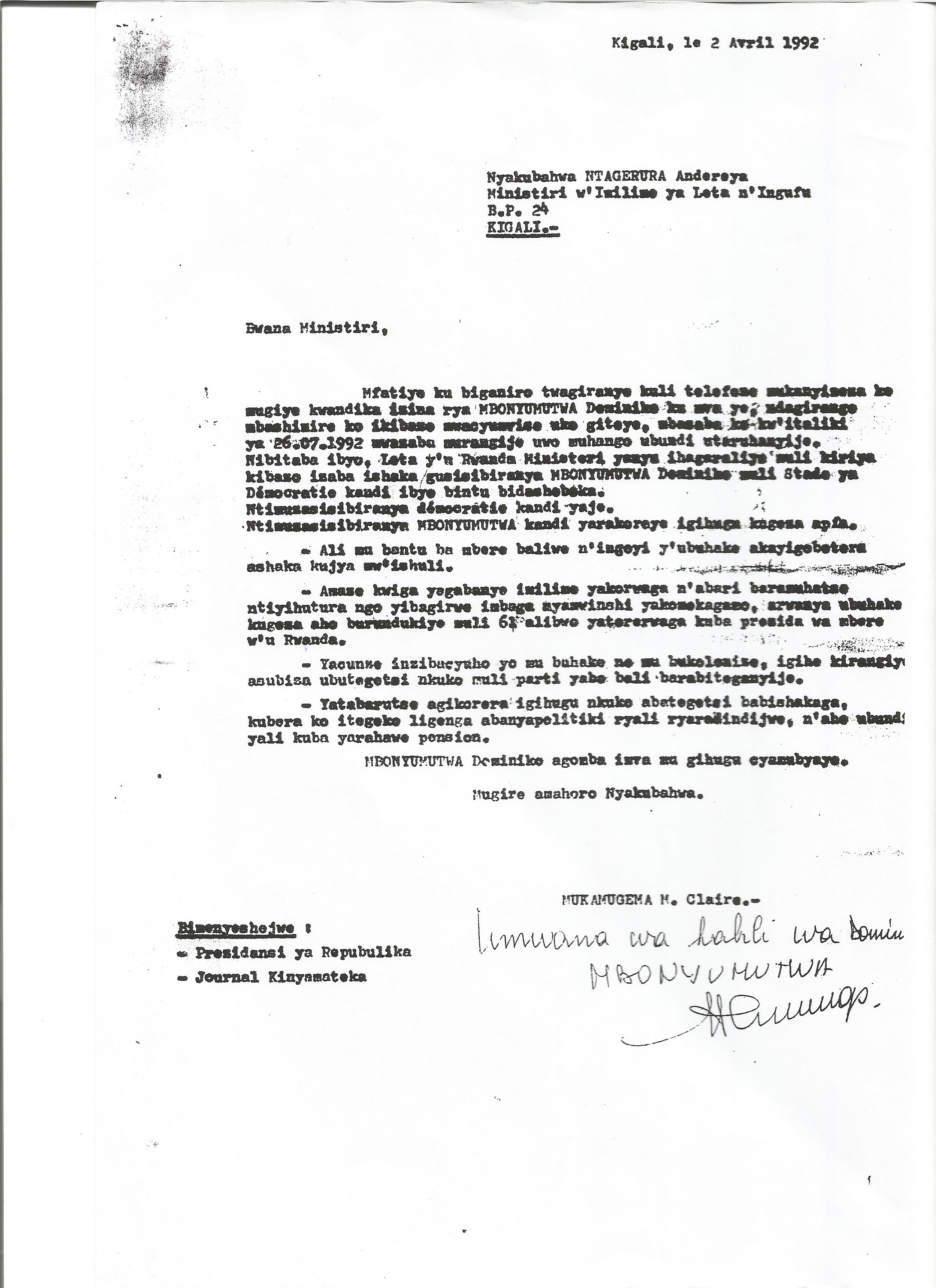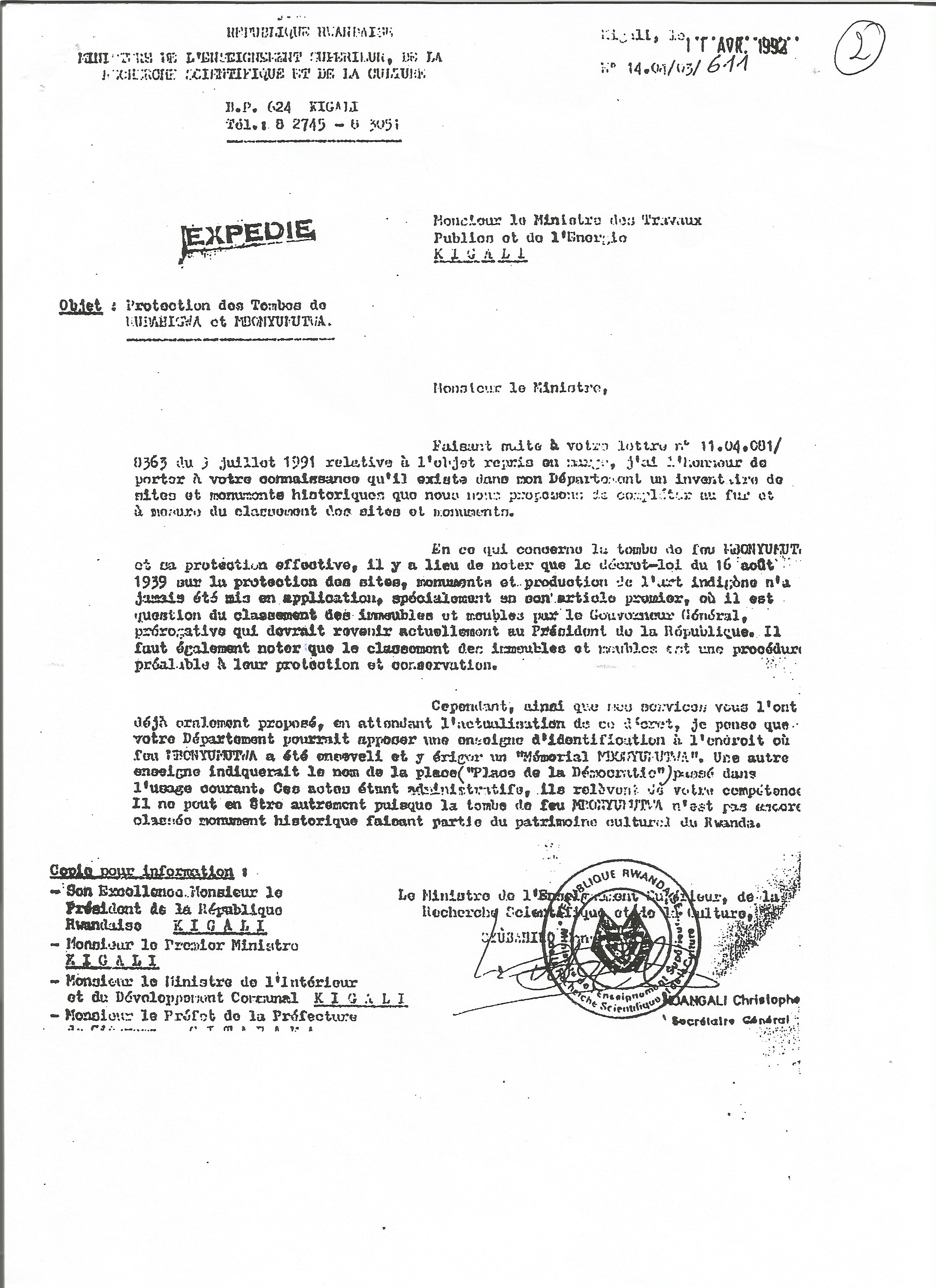 Protection de la tombe de MBONYUMUTWAProtection de la tombe de MBONYUMUTWA - Une lettre au bureau du Ministre de traveaux publique et de l'energieTélécharger